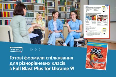 Підручник Full Blast Plus for Ukraine 9 прибирає цей страх за допомогою методики Scaffolding – мовної опори. Секції “Ideas” завжди прийдуть на допомогу тим, в кого немає ідей про що поговорити. А секції “Useful Phrases” є не просто словником, а “милицями” для слабших і трампліном для сильніших учнів: